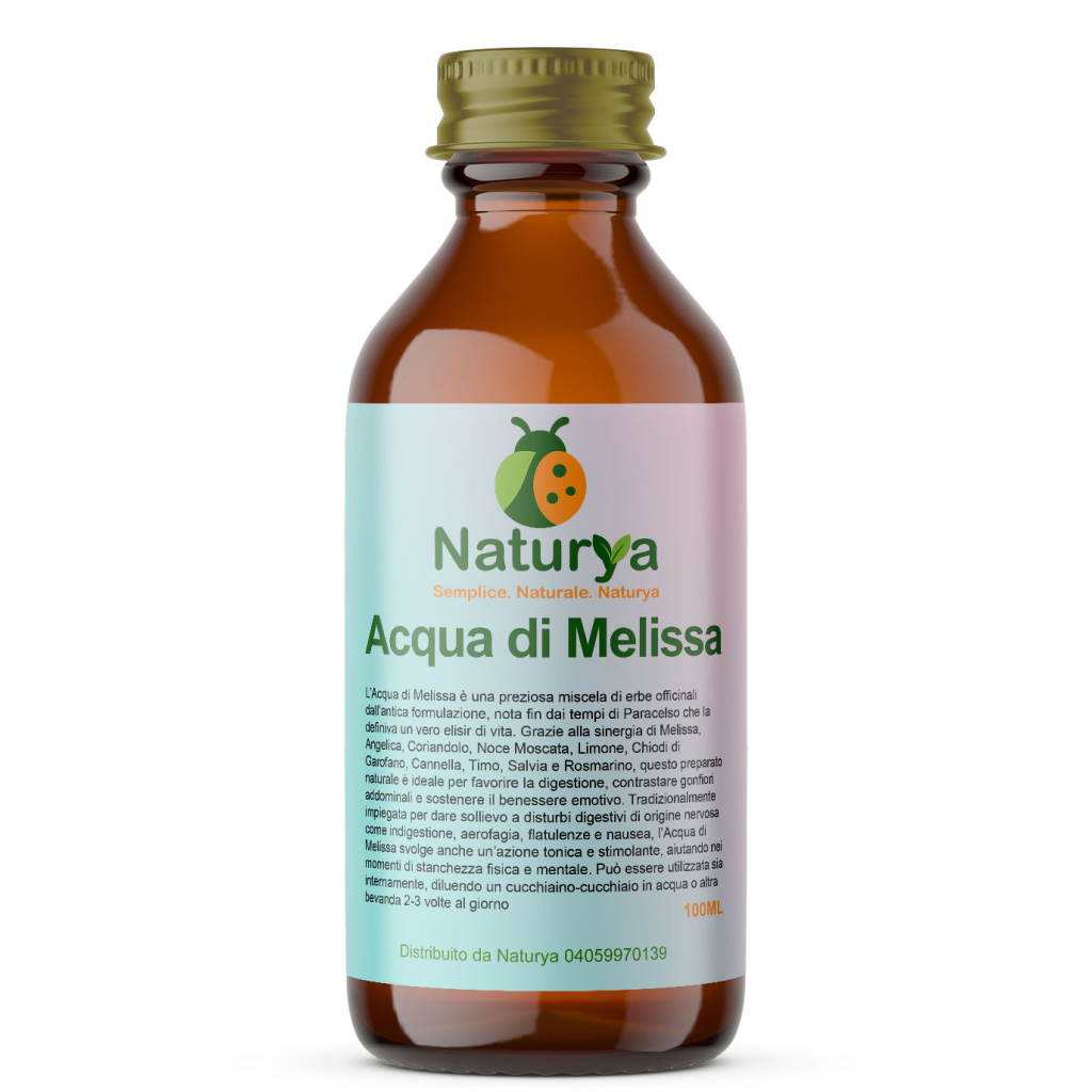 L’Acqua di Melissa è una preziosa miscela di erbe officinali dall’antica formulazione, nota fin dai tempi di Paracelso che la definiva un vero elisir di vita. Grazie alla sinergia di Melissa, Angelica, Coriandolo, Noce Moscata, Limone, Chiodi di Garofano, Cannella, Timo, Salvia e Rosmarino, questo preparato naturale è ideale per favorire la digestione, contrastare gonfiori addominali e sostenere il benessere emotivo. Tradizionalmente impiegata per dare sollievo a disturbi digestivi di origine nervosa come indigestione, aerofagia, flatulenze e nausea, l’Acqua di Melissa svolge anche un’azione tonica e stimolante, aiutando nei momenti di stanchezza fisica e mentale. Può essere utilizzata sia internamente, diluendo un cucchiaino-cucchiaio in acqua o altra bevanda 2-3 volte al giorno, sia esternamente per frizioni su fronte e stomaco in caso di emicrania, vertigini, shock emotivi o crisi di stress. Ottima anche come antisettico naturale per la disinfezione della pelle, per sciacqui o gargarismi contro mal di gola o per lenire piccole ferite e dermatiti. Scopri il potere di un rimedio tradizionale che riporta equilibrio a corpo e mente.