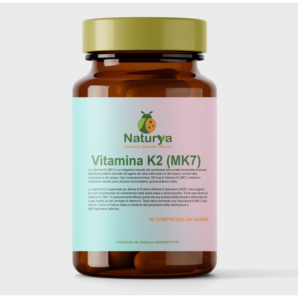 La Vitamina K2 (MK7) è un integratore naturale che contribuisce alla corretta funzionalità di alcune specifiche proteine coinvolte nel legame del calcio nelle ossa e in altri tessuti, nonché nella coagulazione del sangue. Ogni compressa fornisce 100 mcg di Vitamina K2 (MK7), insieme a ingredienti naturali come cellulosa microcristallina, gomma arabica e silice.
